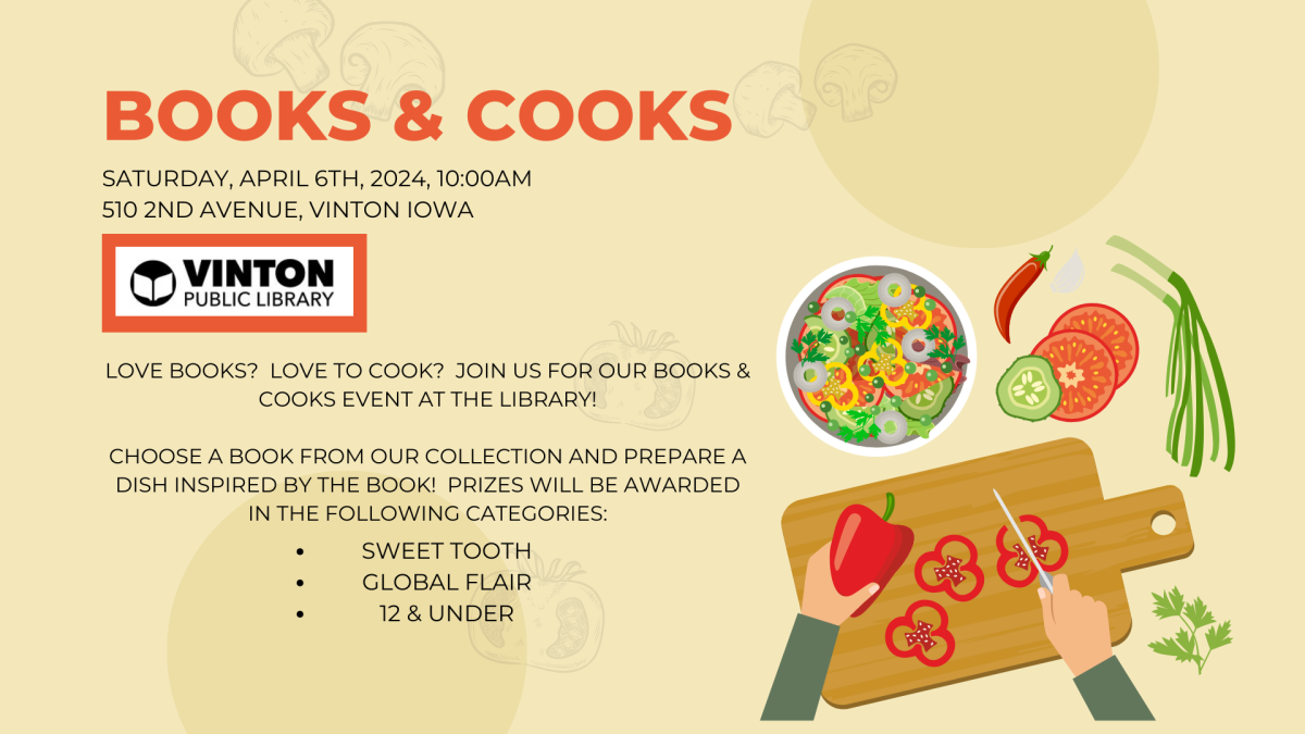 The Vinton Public Library will offer a Books and Cooks event at the library on Saturday, April 6th begnning at 10:00 a.m.