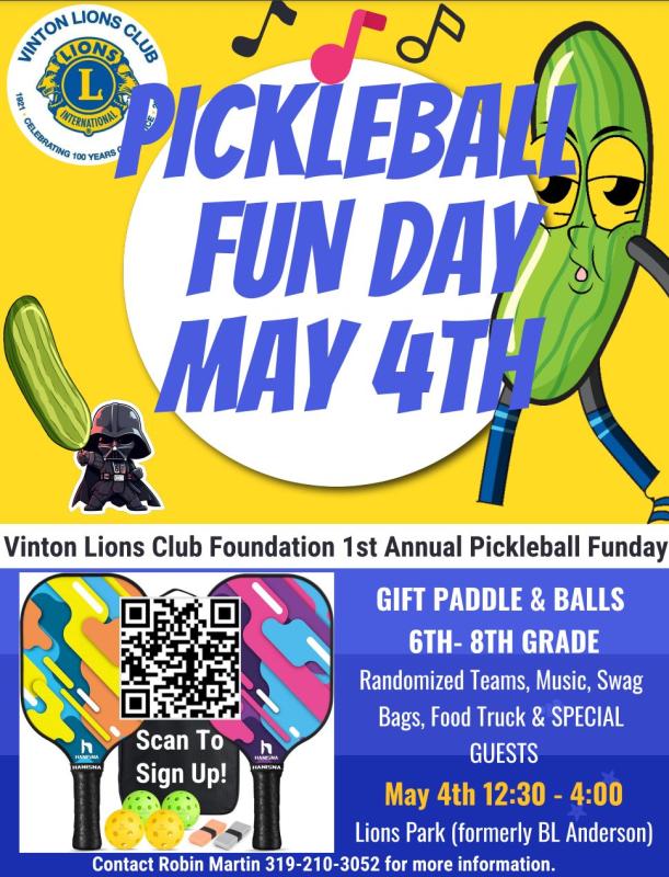 Lions Pickleball Fun Day for VS Middle School students this Saturday, May 4th at Noon at BL Anderson Park.