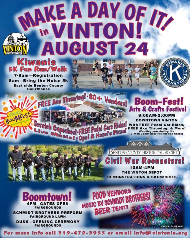 **10 AM - 4 PM**: Civil War Re-enactors at the Vinton train depot (612 2nd Ave). Scrimmages and demos.