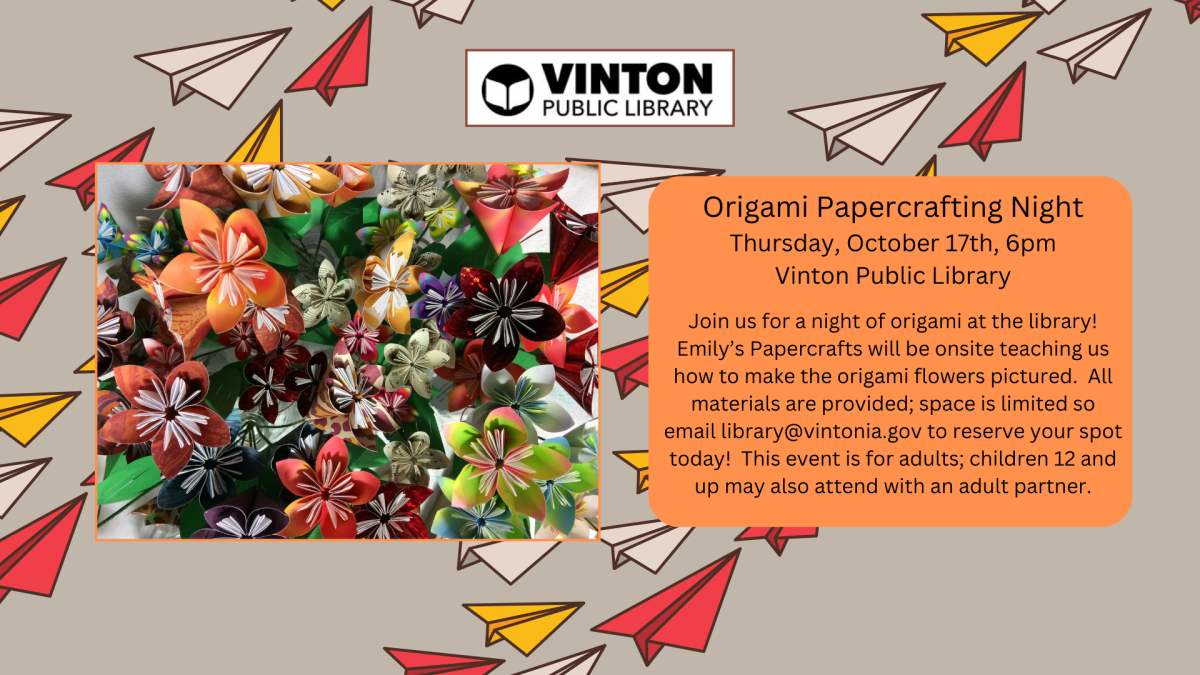 All materials will be provided, but space is limited. To register for the class email the library at: library@vintonia.gov