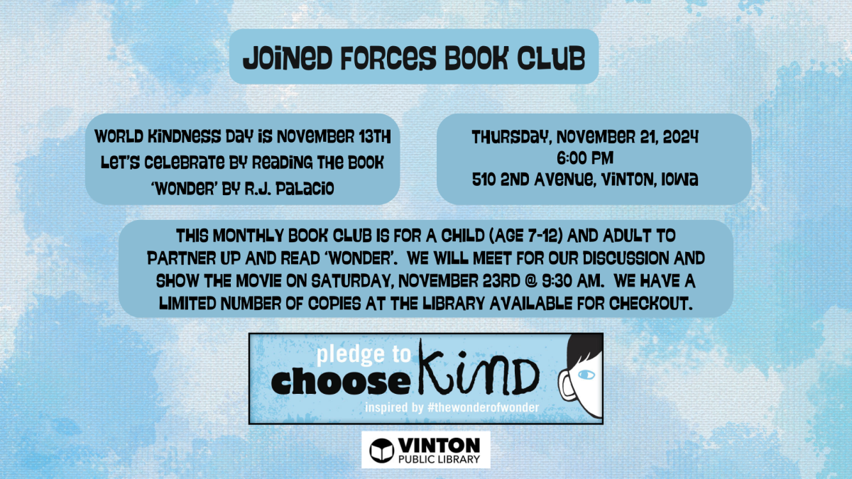 Let's celebrate World Kindness Day by reading the book 'Wonder' by R.J. Palacio. Join us for a book discussion Thursday, November 21st at 6 pm and then stop back on Saturday morning, November 23rd to watch the movie!