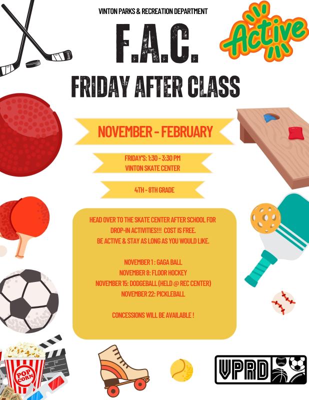 Vinton Parks and Recreation is introducing F.A.C. (Friday After Class)! Starting Nov 1st, we will be opening the Skate Center from 1:30 - 3:30 PM on select Fridays through February for drop-in activities!! This will be for students in 4th-8th grade within the V/S school district. Feel free to stay for 30 minutes or the whole 2 hours, it's up to you!