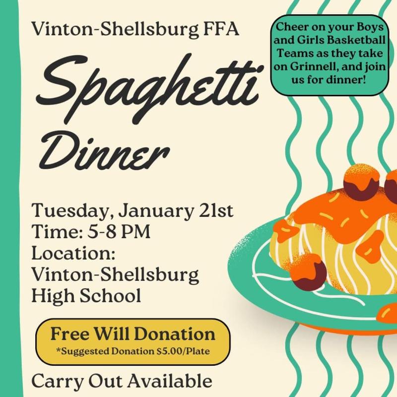 Join the Vinton-Shellsburg FFA for a spaghetti supper at the Vinton-Shellsburg High School on Tuesday, January 21st, 2025/ This is a fundraising event for the local FFA organization.