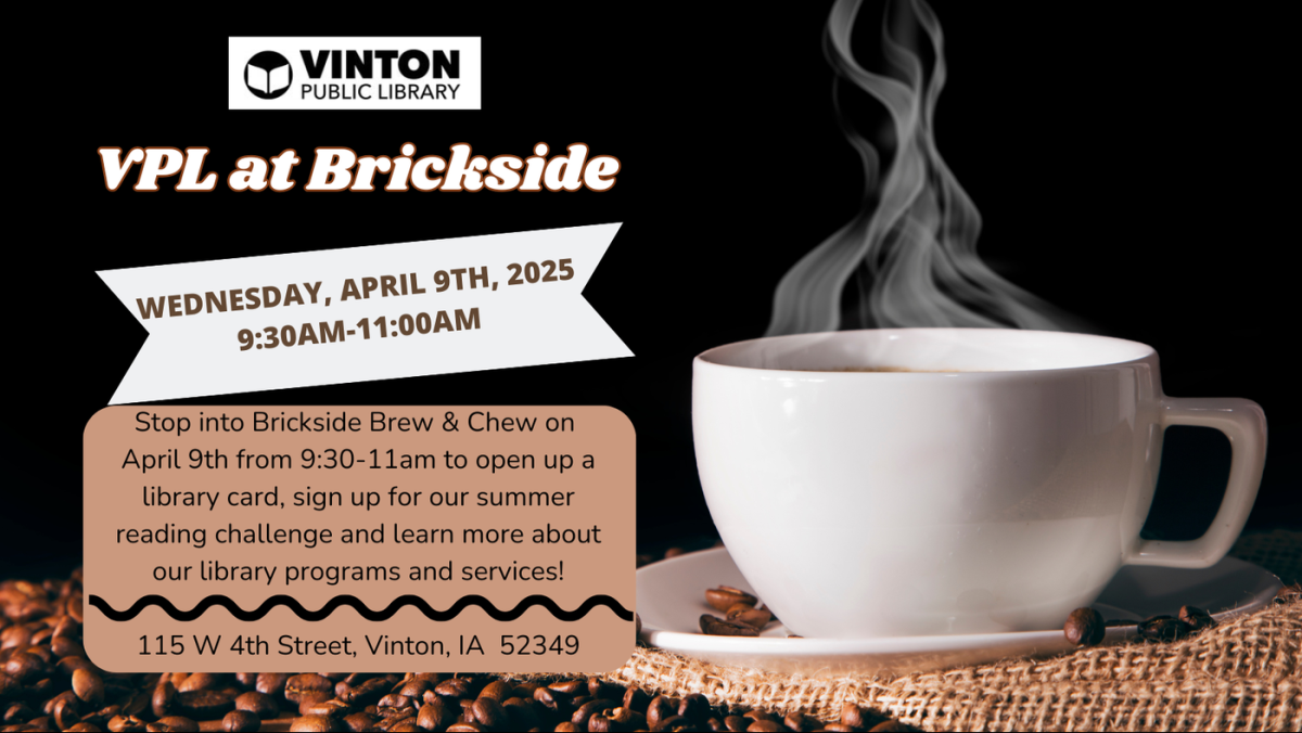 It's National Library Week and we're celebrating with some community outreach! Stop by Brickside Brew and Chew in downtown Vinton on Wednesday, April 9, 2025 from 9:30-11 a.m. to open up a library card, sign up for our summer reading challenge and learn more about our library programs and services.
