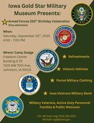 On behalf of our good friends at the Iowa Gold Star Military Museum on Camp Dodge, Iowa Department of Veterans Affairs (IDVA) extends their invitation to attend the Armed Forces 250th Birthday Celebration at the Freedom Center on Camp Dodge, Johnston, Sept. 20th, from 4-7 p.m.