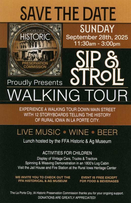 If you’ve ever wanted to walk down Main Street and feel like you were stepping through the pages of a history book — without the smell of dust or the threat of a pop quiz — here’s your chance. On Sunday, September 28, from 11:30 a.m. to 3:00 p.m., the La Porte City Historic Preservation Commission is rolling out its annual Sip & Stroll Walking Tour.