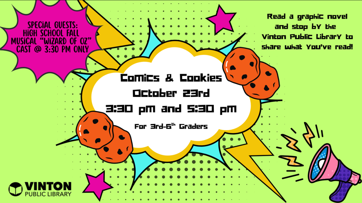 This program is for the comic loving tweens! 3rd-6th graders are invited to a NEW comic book club. Join us and share what you're reading while eating a yummy treat. Special guests from the Vinton Shellsburg High School fall musical "Wizard of Oz" cast will be joining the 3:30 pm group!