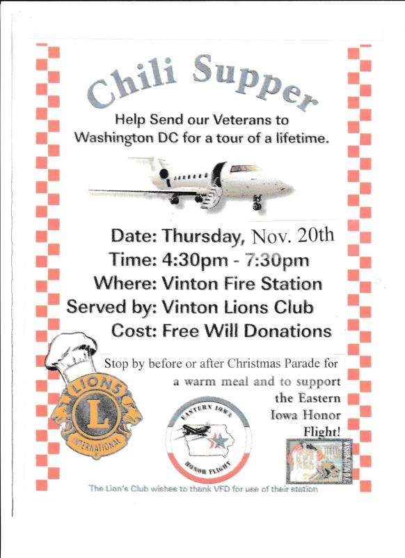Join us this Thursday, November 20, from 4:30-7:30 p.m. and let the Vinton Lions Club serve up a hot bowl of chili at the Vinton Fire Station. For a freewill donation you can support out veterans!