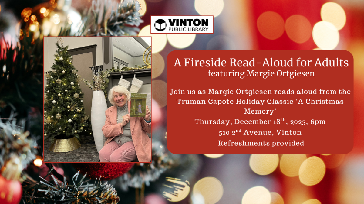 Join us for a cozy read-aloud for adults at the Vinton Public Library! Margie Ortgiesen is joining us once again, reading Truman Capote's holiday classic, 'A Christmas Memory.' Refreshments will be provided.