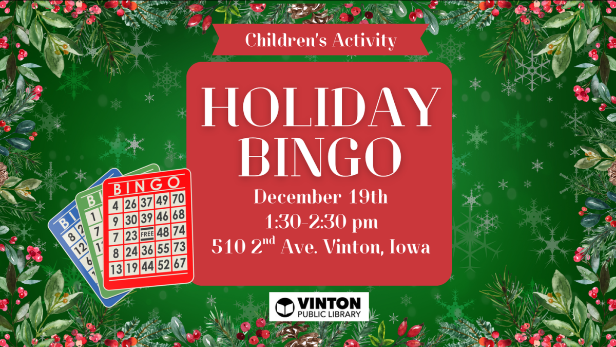 Stop by the library this winter break for some Holiday Bingo on Friday, Dec 19, 2025, at 1:30 PM