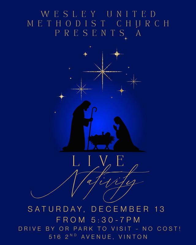 Join Wesley United Methodist Church as they host a Live Nativity on Saturday, December 13, from 5:30 p.m. to 7:00 p.m.