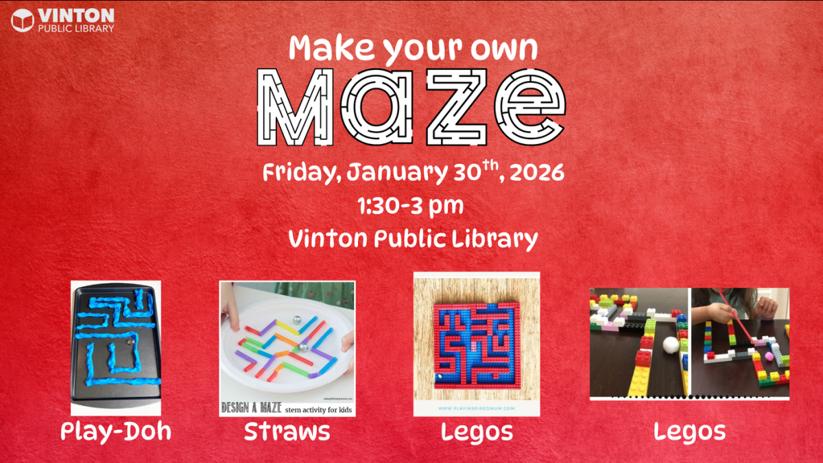 Using different supplies, children can create and explore different ways to design a maze. When? On Friday, January 30, at 1:30 p.m.