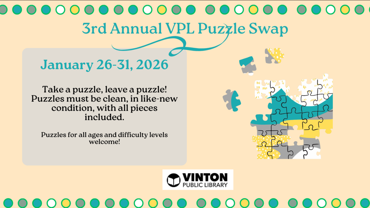 Join us at the library from January 26-31 for our 3rd annual puzzle swap! Bring a puzzle, take a puzzle; it's as simple as that! Puzzles must be clean and in like-new condition.