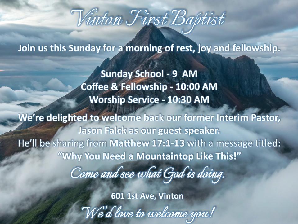 We'd Love to Welcome You at Vinton First Baptist Church, 601 1st Ave., in Vinton.
