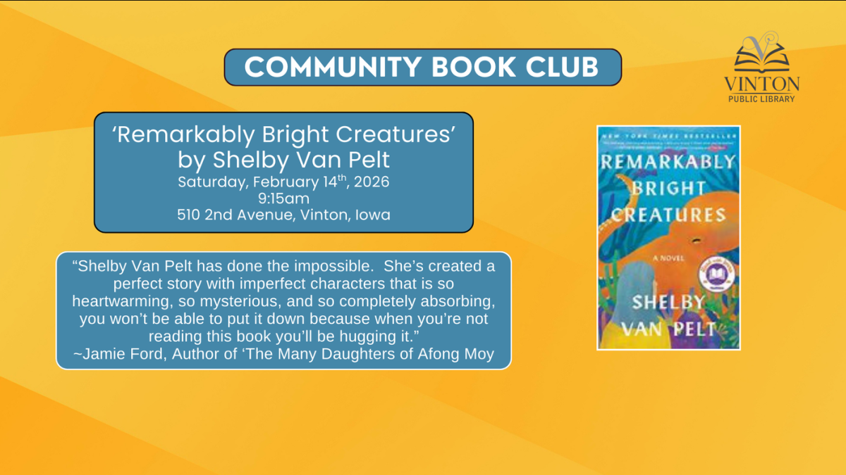 Join us for our Community Book Club as we discuss 'Remarkably Bright Creatures' by Shelby Van Pelt. We have a limited number of copies of the book available for check out.