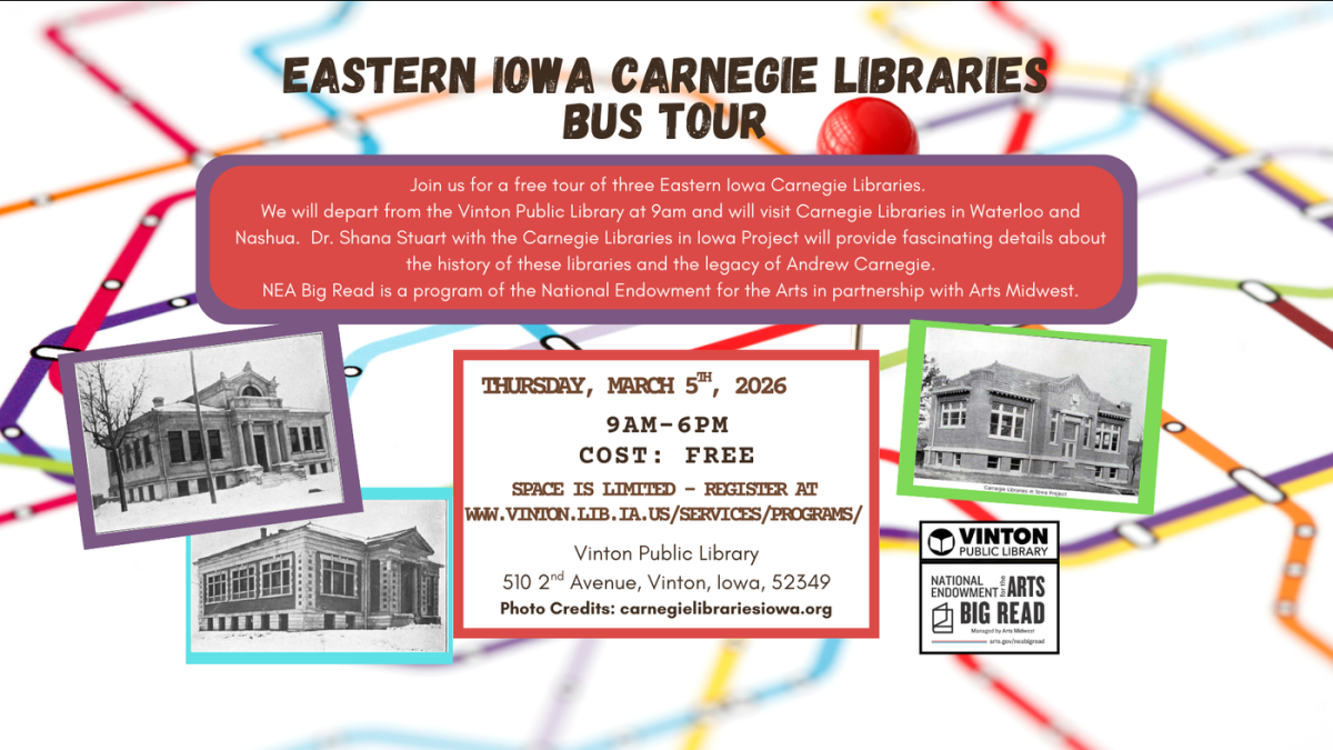 Join us for a free tour of three Eastern Iowa Carnegie Libraries. We will depart from the Vinton Public Library on March 5th at 9 am and will visit Carnegie Libraries in Waterloo, Waverly and Nashua. Dr. Shana Stuart with the Carnegie Libraries in Iowa Project will provide fascinating details about the history of these libraries and the legacy of Andrew Carnegie. Space is limited; register by February 12th, 2026, by visiting www.vinton.lib.ia.us and click on the Vinton's Big Read registration link.