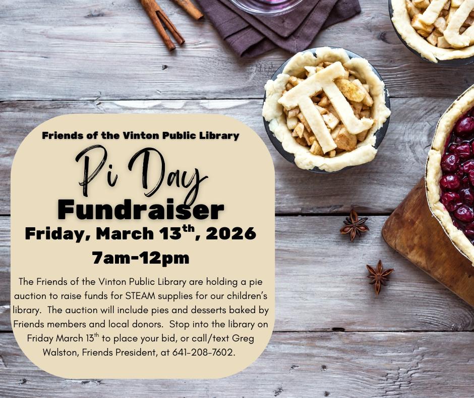 March 14th is National Pi Day. The Friends of the Vinton Public Library will be conducting a silent auction of pies Friday, March 13th. The auction will include pies baked by Friends members and donors.