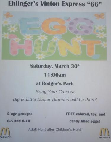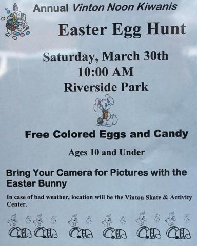 Editor\'s Note: Carol, there are two separate Easter Egg Hunts; the Kiwanis at 10; the one at Rodgers Park northwest of Vinton at 11.