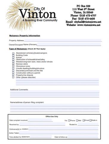 Vinton Residents will now be able to report a nuisance to the City of Vinton directly. Before now, residents contacted a council member or the Mayor to voice complaints. Neither the council nor the Mayor is in charge of taking care of these issues.