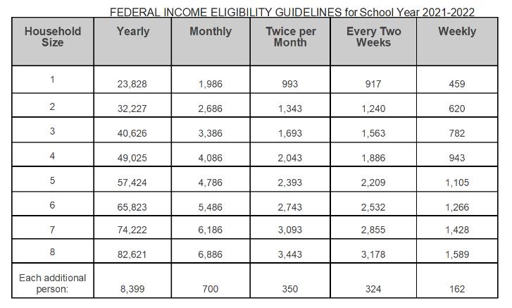 Children may receive free or reduced price meals if your household's income is at or below the limits on the Federal Income Eligibility Guidelines below. (Requires submitting an Application for Free and Reduced Price Meals/Milk.)