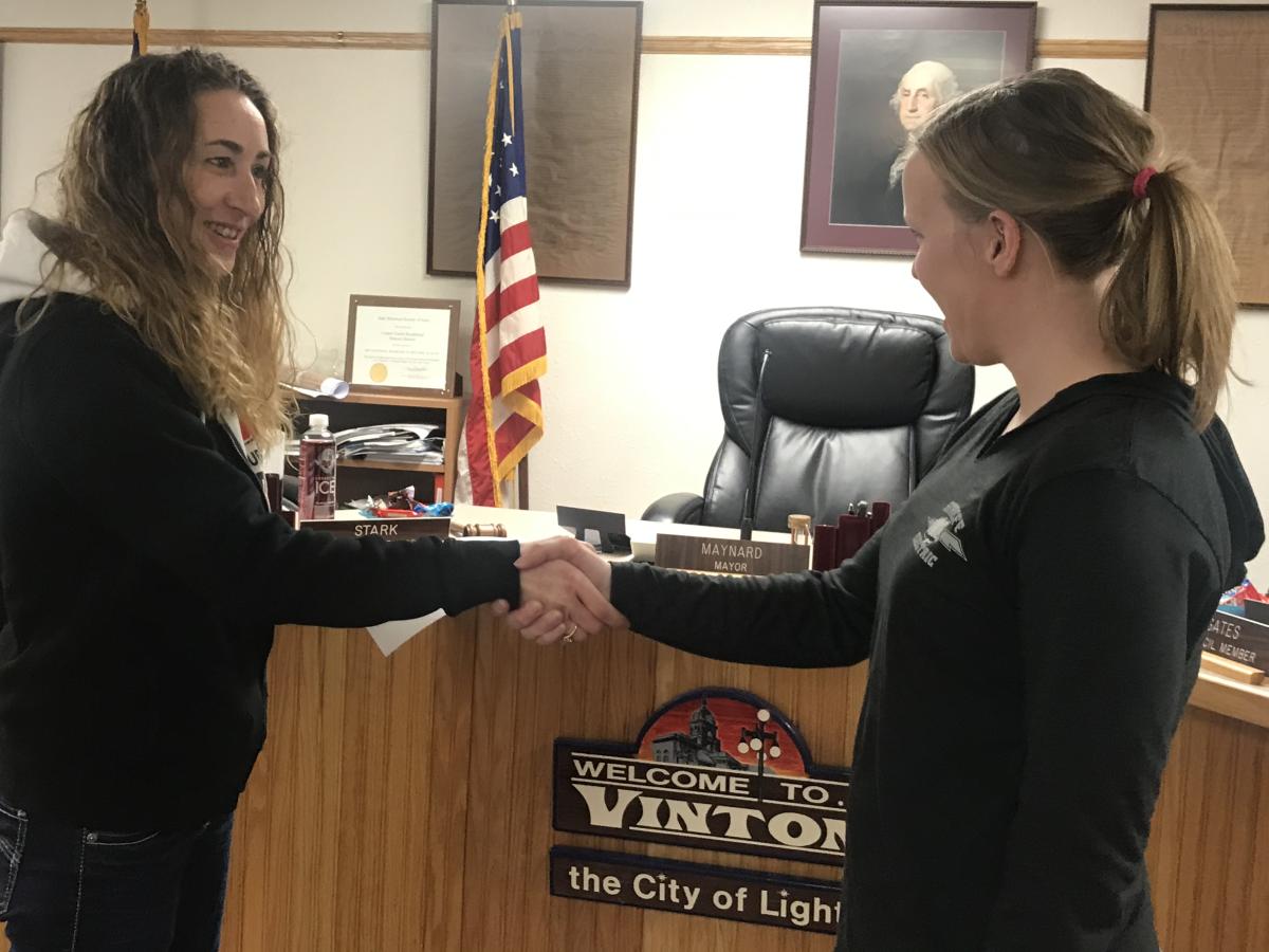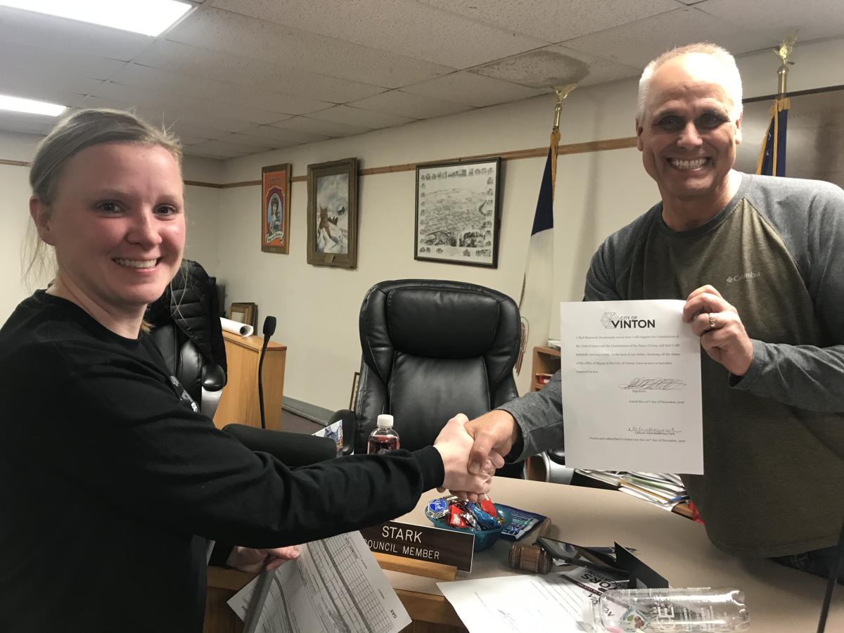 The Mayor delivered the oath of office to Hessenius while the Vinton City Clerk, Melissa Schwan administered the oath to the Mayor, Bud Maynard.