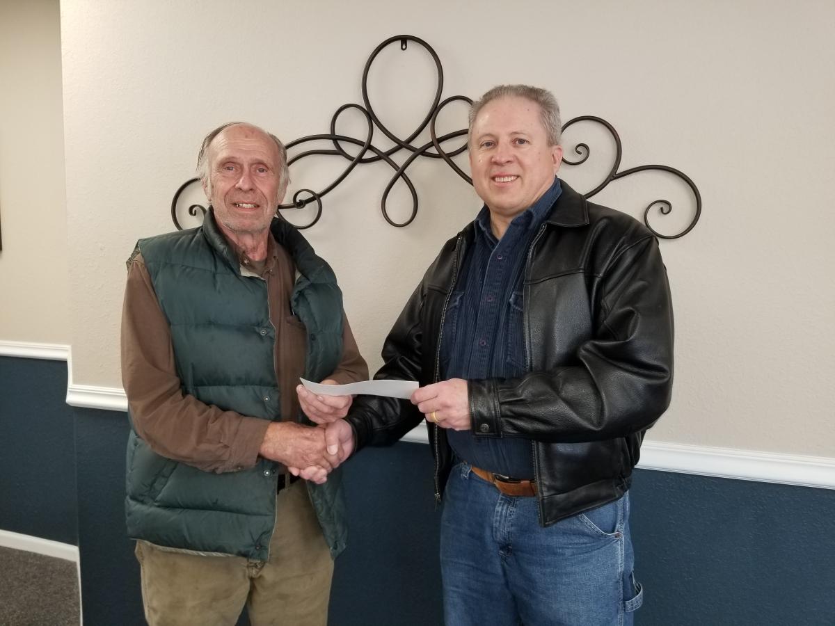 Dave Henkel presented a check to State Representative Tom Gerhold on Friday morning in the amount of $1,000 on behalf of FUELIowa (Petroleum Marketers Trade Association).