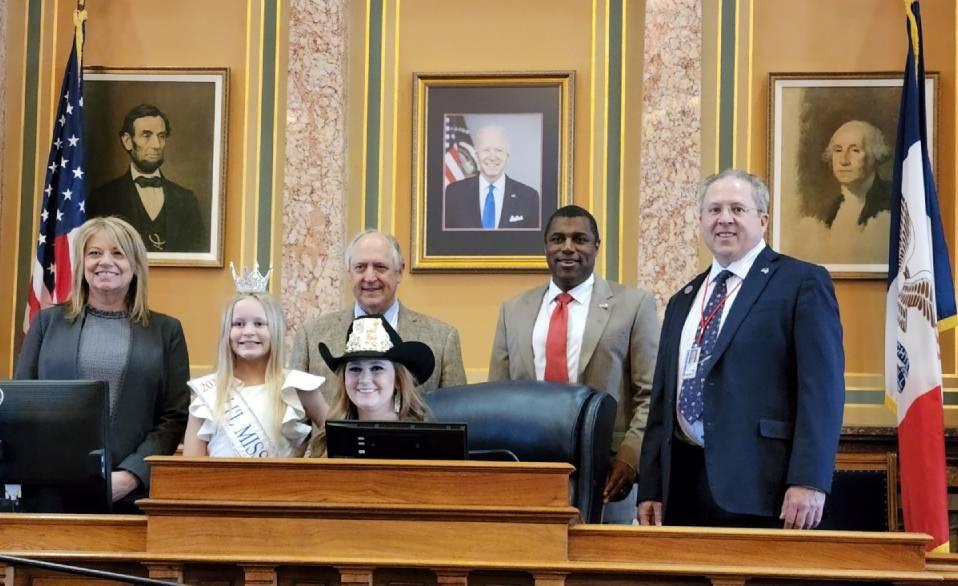 Photo Caption: Seated is Miss Iowa Rodeo Emma Bair, Keswick, at the Capitol promoting the Tri-State Rodeo in Ft. Madison on Sept. 7-10th. Also visiting is 2021 Li’l Miss Iowa Catilyn Barr, Spencer. Also from left are Representatives Cherielynn Westrich, Tom Jeneary, Eddie Andrews, and Tom Gerhold.