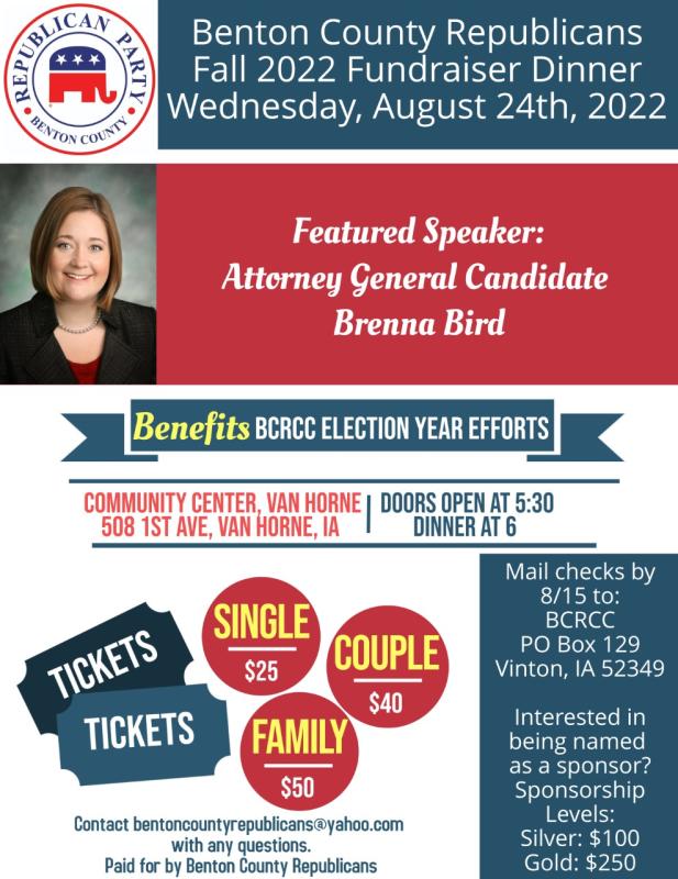 The Benton County Republicans are hosting their annual fundraiser on Wednesday, August 24th, 2022, at the Community Center in Van Horne. Doors open at 5:30 with dinner beginning at 6 p.m. We are excited to welcome the Republican candidate for Iowa Attorney General, Brenna Bird, as our special guest and featured speaker.