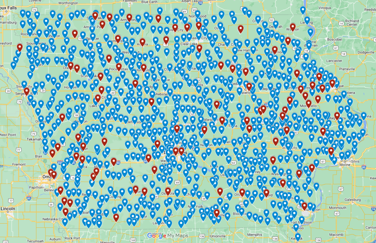 A map is shown in the photo of how many city or county bans still remain in Iowa. Blue indicates either no breed ban or bans on the animal based only on its behavior. Red indicates breed-specific bans or restrictions on select breeds. At this time less than 10% of Iowa has breed-specific bans. Benton County's 20-year-old ban is one of them.