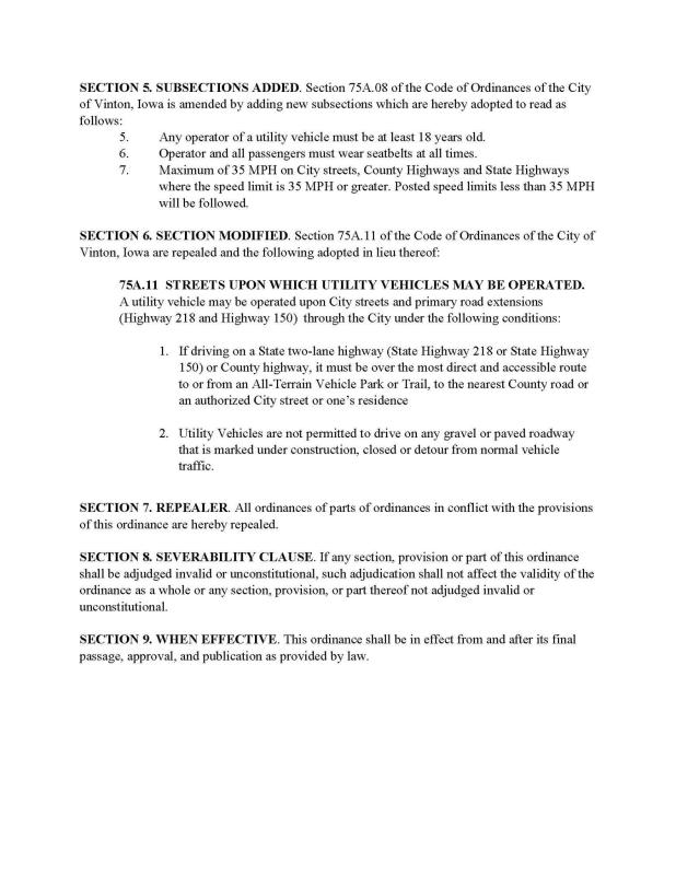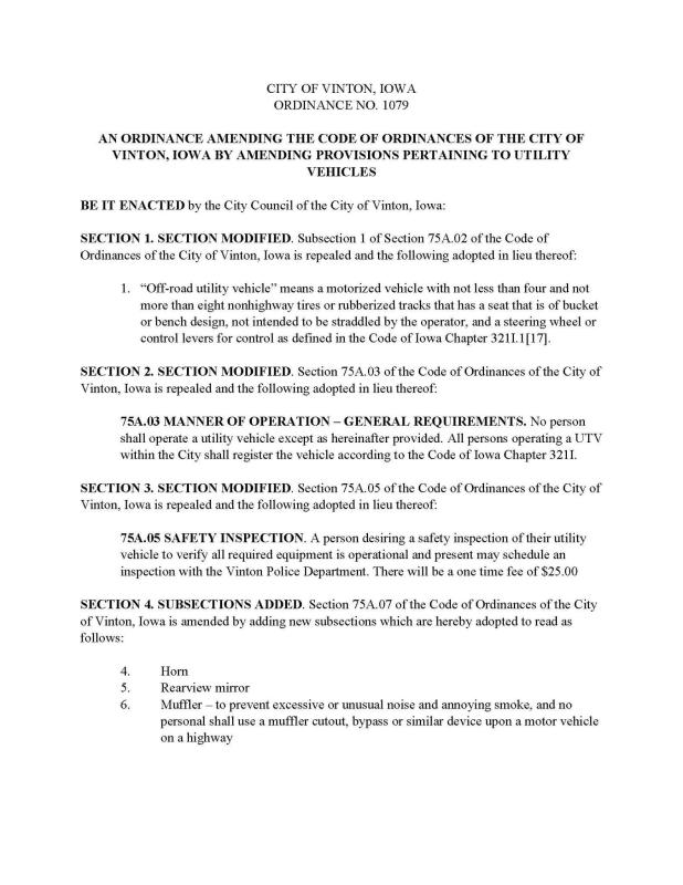 ~ A person desiring a safety inspection of their utility vehicle to verify all required equipment is operational and present may schedule an inspection with the Vinton Police Department. There will be a one-time fee of $25.00