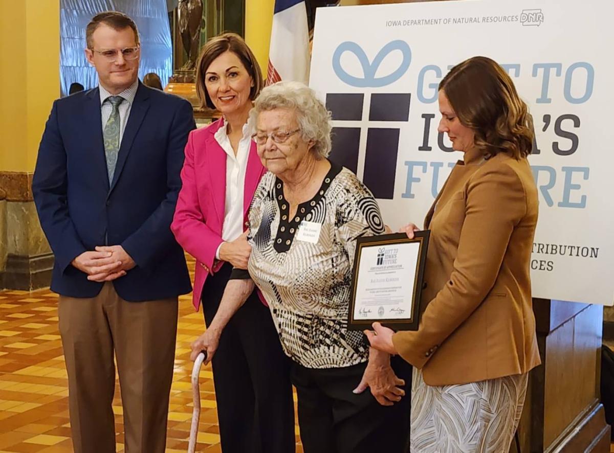 On Thursday, March 14th, constituent Rae Jeanne Kilberger of Palo was recognized at the “Gift to Iowa’s Future” ceremony in the Capitol Rotunda by Governor Kim Reynolds and the Iowa Dept. of Natural Resources. Rae Jeanne donated 83 acres and several hundred thousand dollars to turn this ground into basically a park for public use, fulfilling her grandparents’ wishes. Thank you, Rae Jeanne!