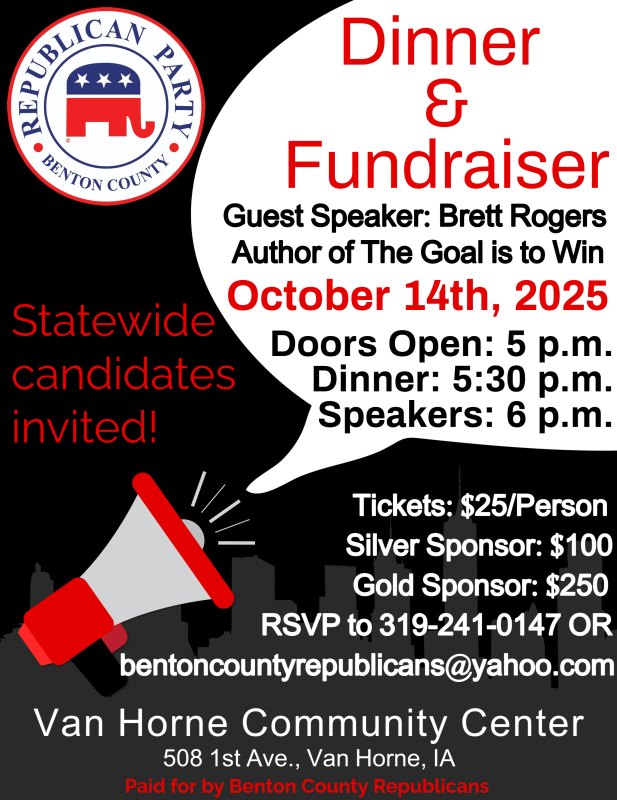 The Benton County Republicans are holding their annual fundraising dinner on Tuesday, October 14th, at the Van Horne Community Center. Doors open at 5:30, with dinner starting at 6 p.m.