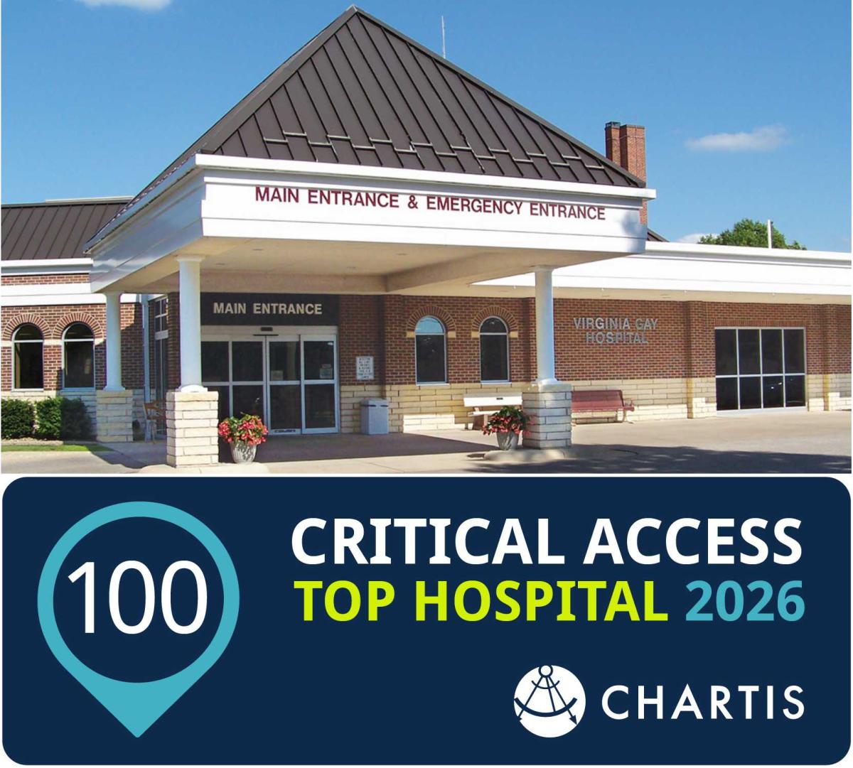 Virginia Gay Hospital in Vinton, IA today announced it has been recognized as a 2026 Top 100 Critical Access Hospital by The Chartis Center for Rural Health. The Top 100 awards program celebrates outstanding performance annually among the nation’s rural hospitals based on the results of the Chartis Rural Hospital Performance INDEX®.