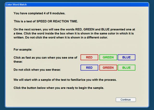 The test includes reading a list of words, one at a time, and then being asked to remember what words are on the list. Other parts of the test include remembering shapes, responding quickly to whether the student sees a red circle or blue square. One part of the exam gives the athletes three letters to remember in order, then runs them through a series of other tests before asking them to list those three letters again. The test ends by asking the students about the list of words at the beginning of the assessment.