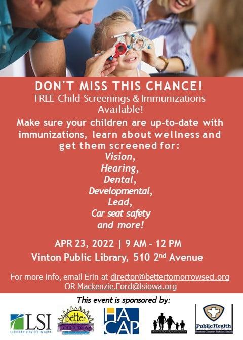 On Saturday, April 23, 2022 from 9:00 AM to noon at the Vinton Public Library, a free health and wellness event will be held for families with young children.