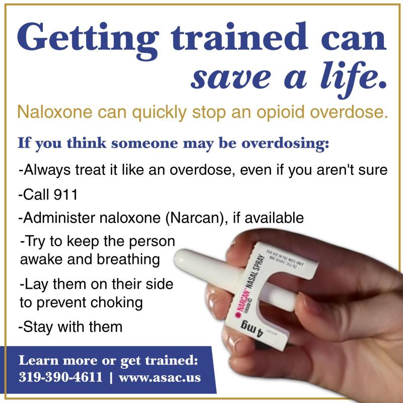 Did you know that ASAC's prevention team offers naloxone (Narcan) training for groups or individuals? Naloxone is the best way to assist someone experience an opioid overdose and can save a life. ASAC's Prevention Specialists recommend that anyone who uses, or is close to someone who uses, illicit or prescribed opioids be trained to the use of naloxone.
