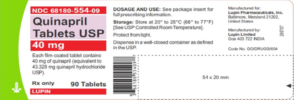 Quinapril tablet USP is an angiotensin-converting enzyme (ACE) inhibitor indicated for the treatment of hypertension, to lower blood pressure. Lowering blood pressure reduces the risk of fatal and nonfatal cardiovascular events, primarily strokes and myocardial infarctions. Quinapril Tablets USP 20mg, and 40mg is packaged in 90 count bottles and was distributed nationwide in the US to wholesalers, drug chains, mail order pharmacies and supermarkets. The recalled lots are included in the table below: