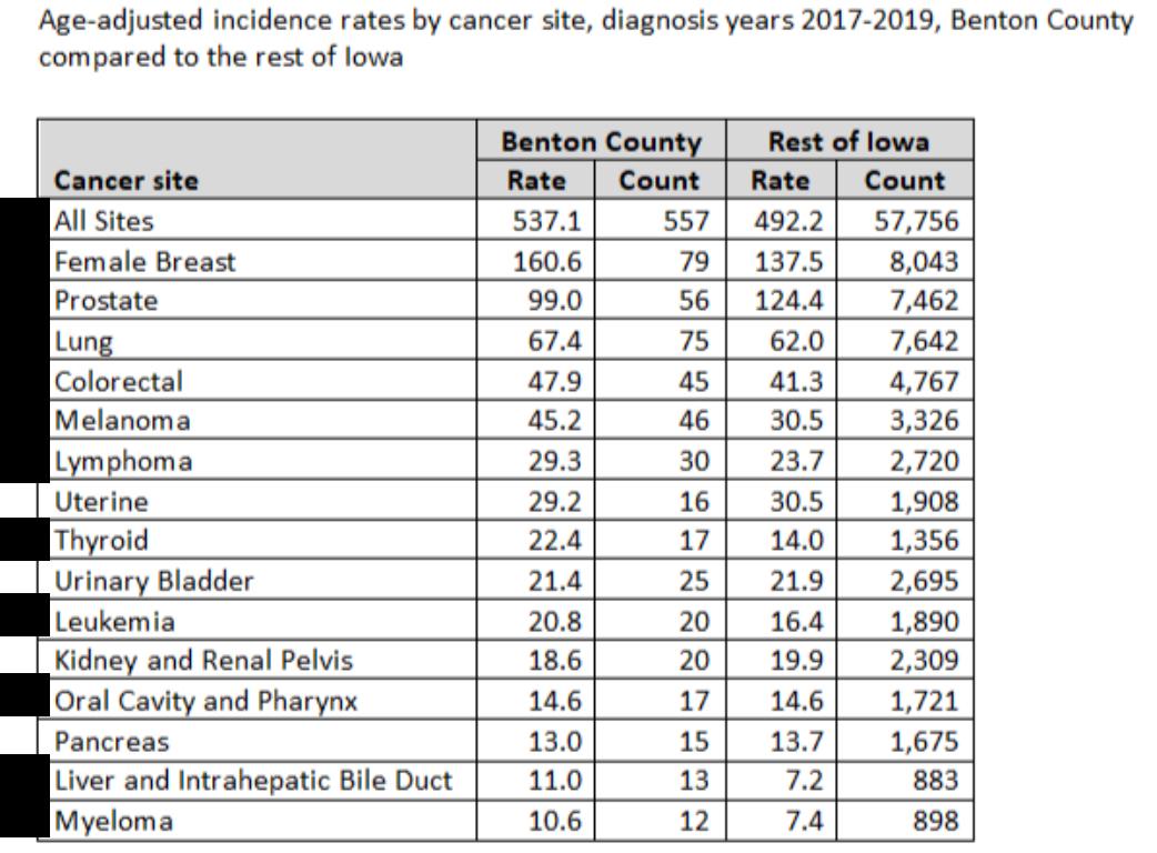One-half of all cancer types in Iowa are made up of breast, prostate, lung and colorectal cancers while in Benton County, the top four consist of female breast, prostate, lung, and colorectal cancers. Overall, Benton county exceeds the state rate in all forms of cancer except four while exceeding the state's total cancer rates.