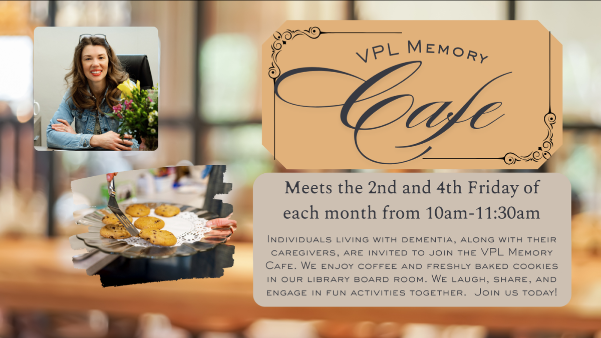 Individuals living with dementia, along with their caregivers, are invited to join the VPL Memory Cafe. We enjoy coffee and freshly baked cookies in our library board room. We laugh, share, and engage in fun activities together.