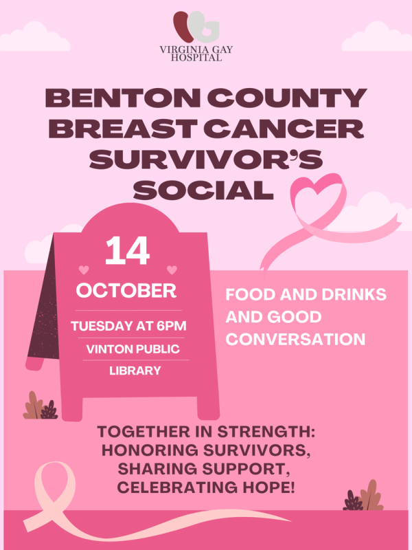 Join the Benton County Breast Cancer Survivors Social at the Vinton Public Library, 510 2nd Ave. Vinton. on Tuesday, October 14, at 6:00 p.m.
