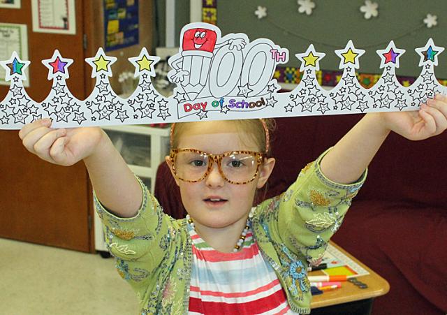 Tilford first grade students marked the 100th day of school with a variety of lessons about the number 100. They dressed up as they thought a 100-year-old might dress, filled bags with 100 crackers, candies, and other items to demonstrate what 100 looks like, and colored crowns.