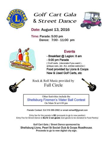 The 1st Annual Shellsburg Lions Golf Cart Gala and Street Dance will take place Saturday, Aug. 13.