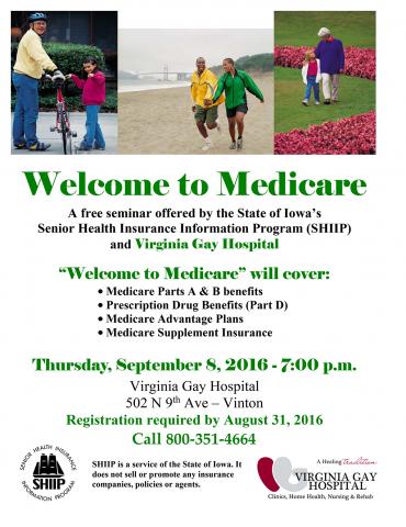 This two hour seminar offered by Virginia Gay Hospital and Clinics, with trained SHIIP counselors, will be held Thursday, September 8th starting at 7:00PM. The seminar will be held at in the hospital dining room, 502 North 9th Avenue, Vinton. Please register no later than August 31st by calling SHIIP at 800-351-4664.