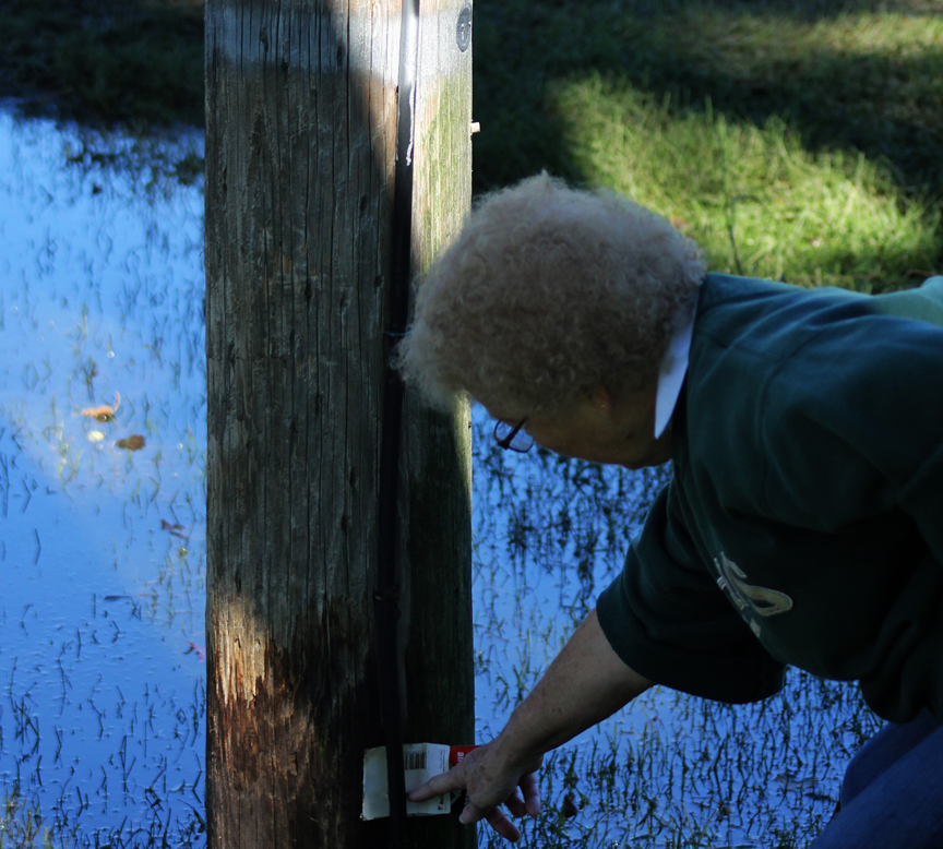 Across the street from Veterans Park, Carol Geiger points out a cross that marked how far the water reached into her front yard. Also, on the pole near the street, a piece of paper marked this year's high water mark level -- three feet below the painted line that indicates how high the water was in June of 2008.
