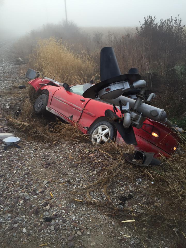 Earlier on Tuesday, a car was heading toward Shellburg on County Home Road and due to the fog a driver was unable to see the train cars on the tracks. The driver swerved to the side of the road, knocking down one of the signals, which landed on the back of the car.