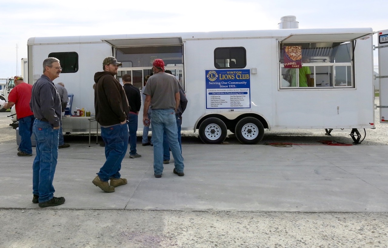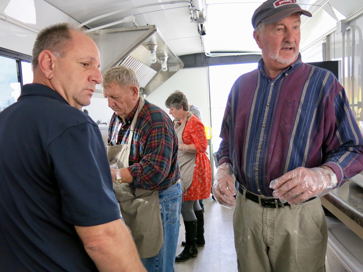 Jim Williams turns from inspecting the new vent in operation and heads around the corner to order lunch at the concession window. Ideal Industries volunteered the time of willing employees to help retrofit the Vinton Lions' new fundraising trailer. The Lions thanked businesses and about 35 individuals for their work with a Nov 17 open-air lunch prepared and served from the trailer. Lions Mike Elwick and Matt Johnson use the fryer in the background to prepare the lunches.