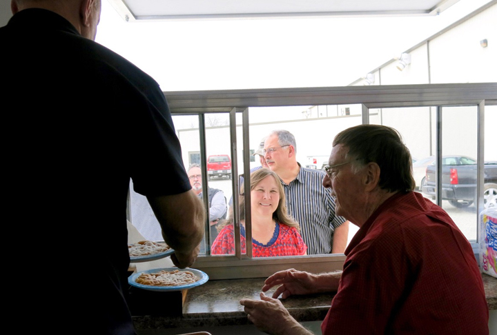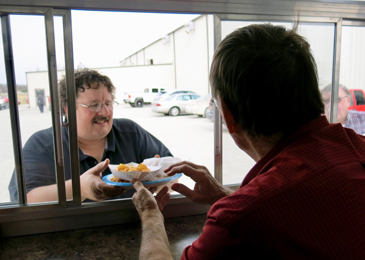 Lion Alan Woodhouse takes lunch orders from Ideal Industries employees at the window of the new concession trailer, thanking those who welded, wired, fueled and plumbed the new trailer this last spring