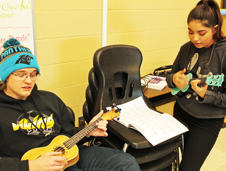 Recently, a few students were sitting around in Michala Martin's choir room, taking turns on Sam Schmidt's uke. Someone suggested starting a Ukulele Club, and soon more than a dozen students had expressed interest. Now there are enough students who are learning the uke that the group can perform in an ensemble during the Talent Show. Martin and the students will be choosing a couple of songs and working on them until Feb. 28. Even though many of them have never played an instrument before, the teacher is confident that they will learn quickly and be ready to perform at the end of next month.