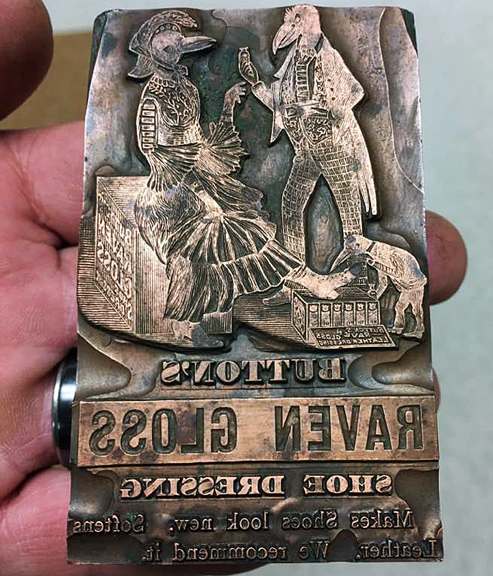 Readers of the ad would see the following message: "Button's Raven Gloss Shoe Dressing... Makes Shoes look new. Softens Leather. We recommend it." Because it is a printing block, the images were reversed, which resulted in a correct orientation when the ink was applied to the paper.