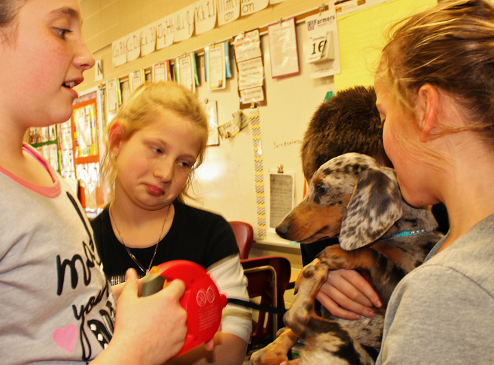 The Tilford students had heard about Cookie, Jade Pohlmann's spotted Dachshund, who was nearly overcome by smoke during a fire last Monday, Feb. 13, and was revived by firemen using an oxygen mask and a unique technique firefighter Rick Lazenby had seen on TV.